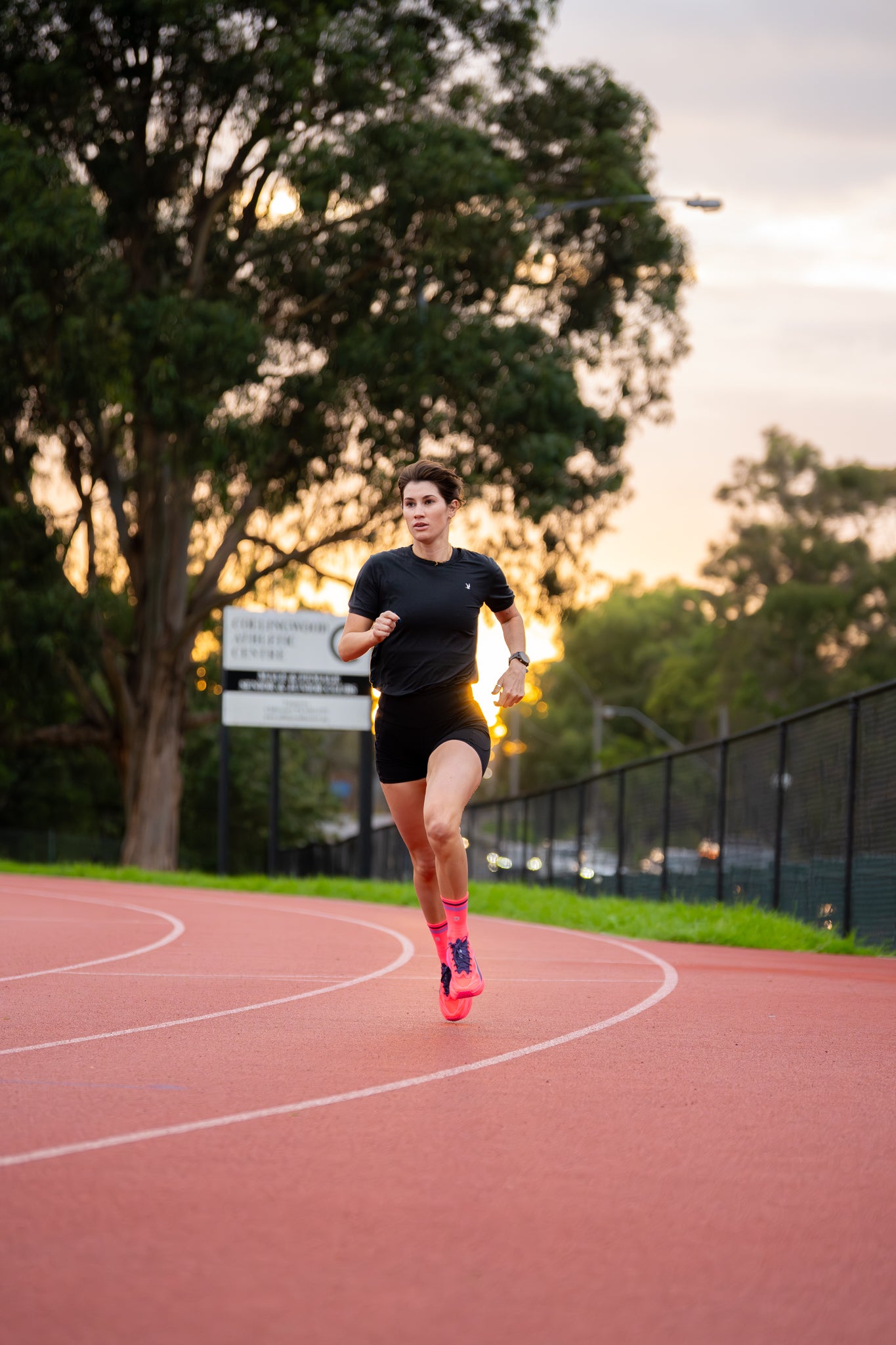 The main difference is their purpose. The ‘racing’ SHYUs have been designed to complement your high performance racing shoe, whereas our ‘training’ SHYUs are more neutral in colour and are designed to complement any shoe and on any run. Because of this different purpose, you’ll find our ‘racing’ SHYU to be a little lighter with less overt cushioning around the ankle compared to its ‘training’ counterpart.