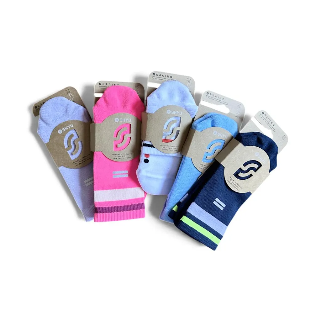 SHYU (pronounced ‘shoo’) is a combination of the words ‘shoe’ and ‘you’. We make performance running socks designed for you and your race days super shoe.