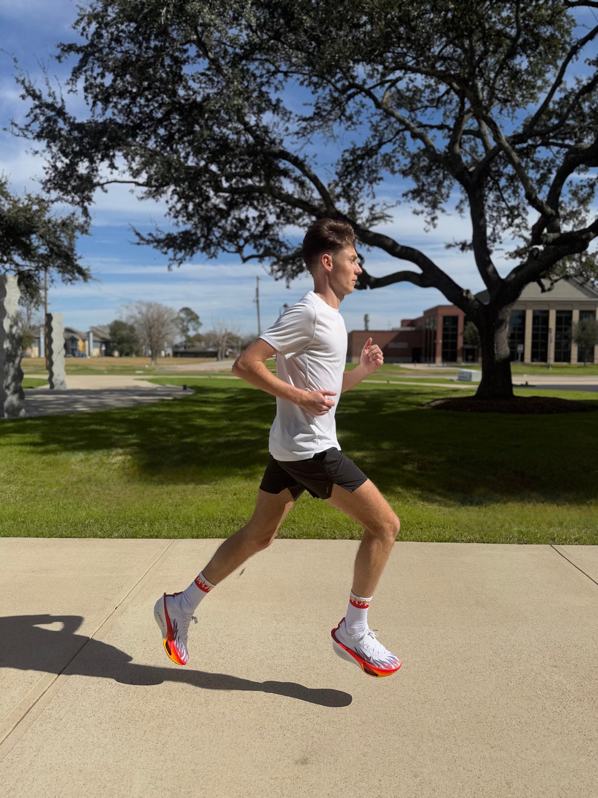We designed these to complement Nike©'s 2024 Ekiden range. Bound to divide opinion, we decided to hop off the fence and create a complimentary SHYU that is fire in every sense, whilst maintaining the subtleness of all our racing SHYU. It pairs perfectly with the whole range including from the Alphafly© Vaporfly© and Zoom Fly 6©